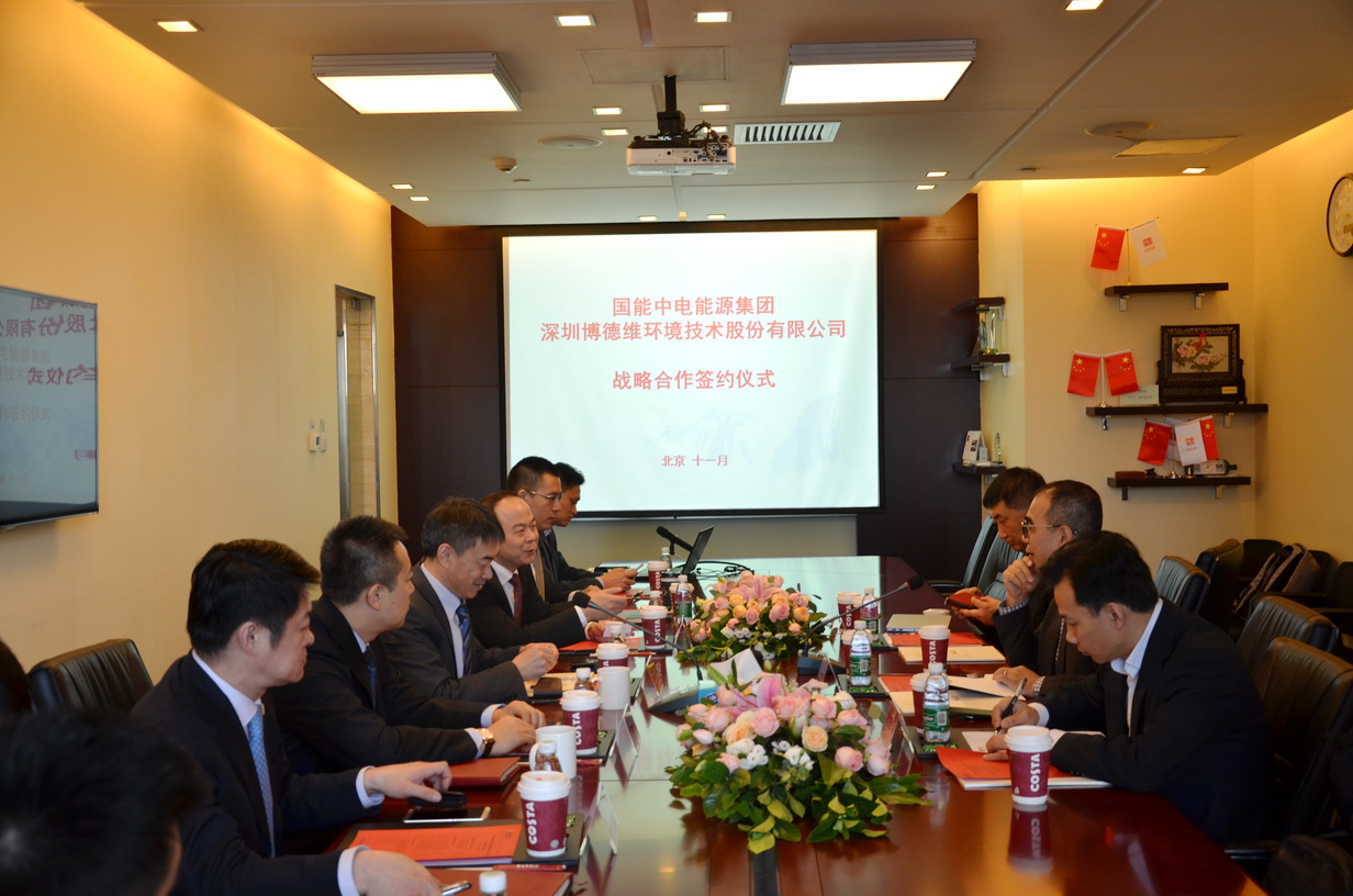 2017年11月8日上午,國能中電能源集團有限責任公司與深圳博德維環(huán)境技術股份有限公司達成戰(zhàn)略合作協(xié)議,并在國能中電集團總部舉行了簽約儀式。博德維總裁蕭龍、技術副總裁王秦、北京公司總經(jīng)理崔艷軍,國能中電集團副董事長裴少華,國能中電集團董事、北京國能中電節(jié)能環(huán)保技術股份有限公司總裁初煒,國能中電集團副總裁、國峰清源生物能源有限責任公司總經(jīng)理楊靜、北京國能中電節(jié)能環(huán)保技術股份有限公司副總裁寇宏偉,國能中電(北京)投資有限責任公司總經(jīng)理王邁,國能中電能源集團廣東分公司常務副總經(jīng)理張翼,北京國能中電節(jié)能環(huán)保技術股份有限公司設計院副院長黃準等領導出席了簽約儀式。